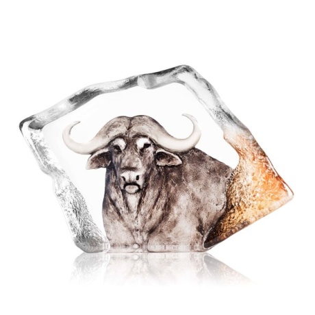MJ34116 Mats Jonasson Crystal - LIMITED EDITION - WILDLIFE The Big Five - Buffalo. This gorgeous, free standing Buffalo crystal sculpture has been cast, sandblasted and hand-painted on the reverse with organic paint. The front is highly polished allowing the colours to shine through. The sculpture is handmade, produced in a limited amount of 299 pieces and is signed on the base.